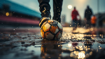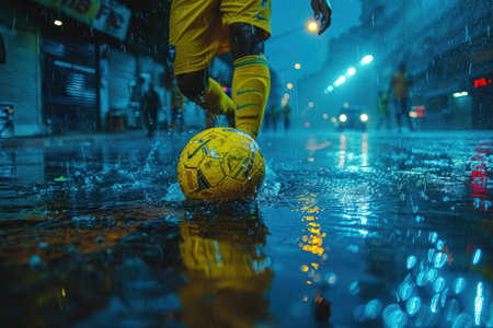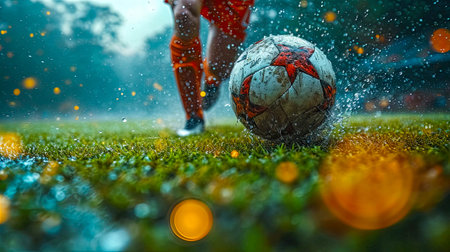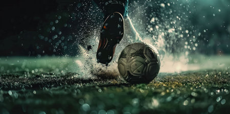 Close up of a soccer player s foot striking a ball on a wet field at night, creating splashes of water