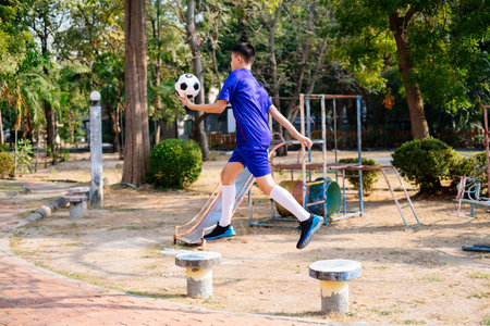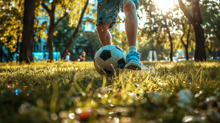 Teenager kicking a soccer ball in a city park, bottom view. Outdoor sport activity. Dynamic photo. Generative AI.