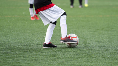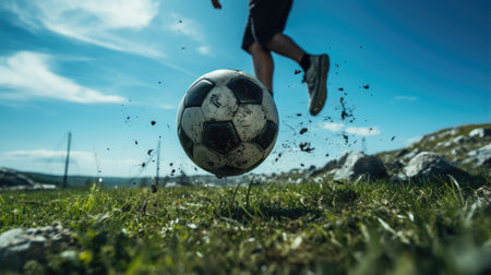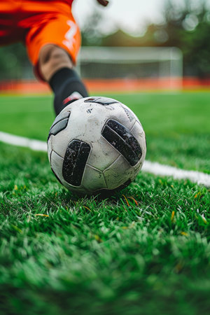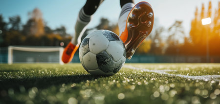 player playing soccer with ball, close up of foot and ball on green grass, by ai generative