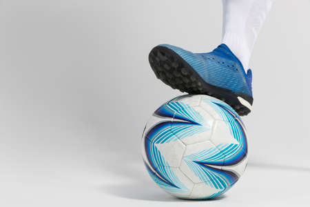 Legs of a football player kicking the ball. Close-up.