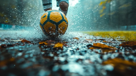 In the midst of an autumn afternoon, a football player skillfully strikes a ball on a lush green field. The sunlight filters through the trees, creating a warm glow, while scattered leaves and a hint of mud add texture to the vibrant scene. Generative AI