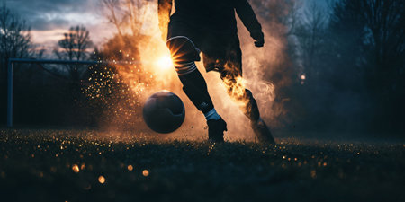 Soccer player kicking the ball on the football field at sunset.