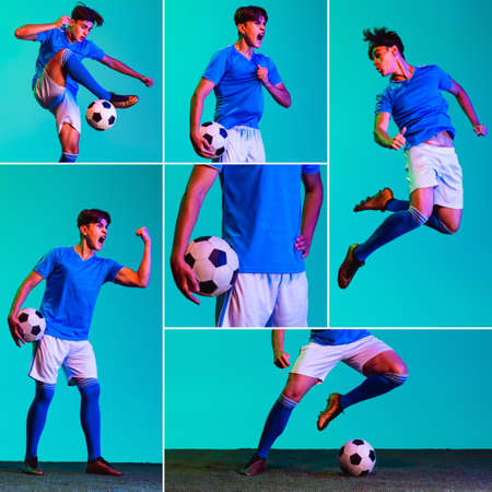 Collage of portraits of young sportsman, soccer football player in motion, training isolated over blue background in neon