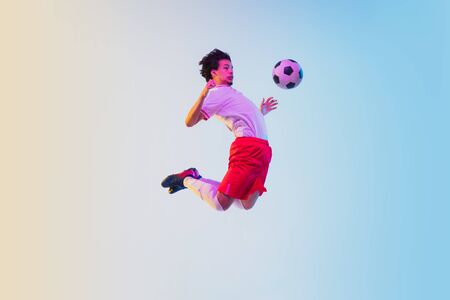 Kicking in jump, on the run. Football or soccer player on gradient background in neon light - motion, action, activity. Concept of sport, competition, winning, action, motion, overcoming. Copyspace.