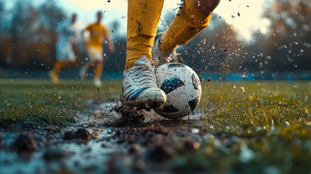 A soccer player in yellow socks skillfully dribbling through muddy grass during a competitive match in autumn. Generative AI