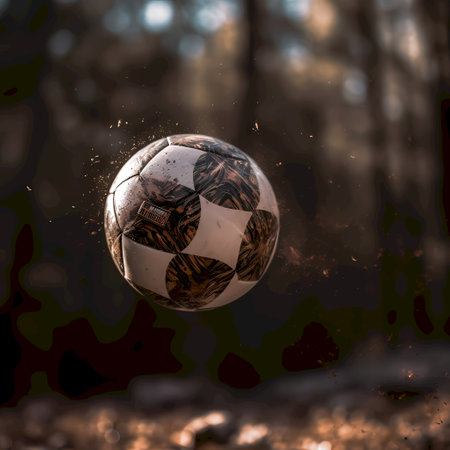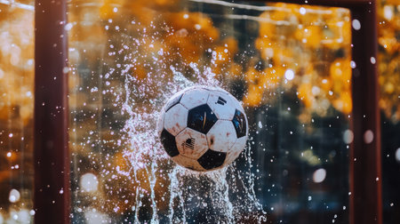 Dynamic close-up of a soccer ball mid-air with water droplets illuminated by sunlight AI