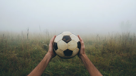 Two hands gripping a soccer ball in front of a foggy field, with the mist adding a mysterious and intense atmosphere --chaos