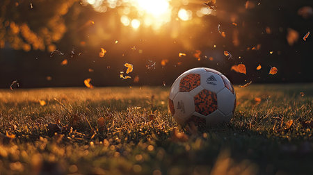 A soccer ball sits on the green grass of a park, surrounded by fallen autumn leaves. The sun sets in the background, casting a warm glow over the scene.