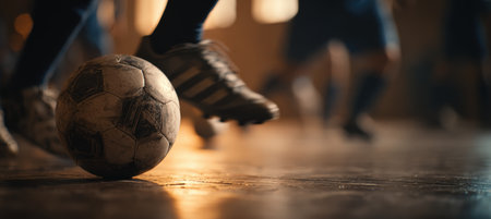 Detailed close-up of a soccer ball with players' shoes in motion, captured with cinematic focus and tension. The image features a shallow depth of field and warm indoor tones.