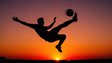 A man in mid-air, kicking a soccer ball against a vibrant sunset background, capturing a moment of athleticism and joy.
