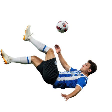 A soccer player in a blue and white jersey is seen mid-air, skillfully controlling a soccer ball with his feet against a white background.