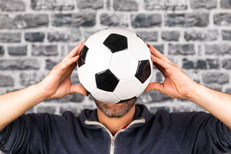 A male holding a soccer ball in front of his face against a grey cobblestone wall