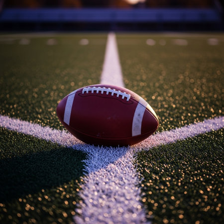 Football on turf, stadium perspective, grand view with vibrant game lights
