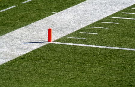 Orange pylon marking the end zone for a football game on q green turf field.