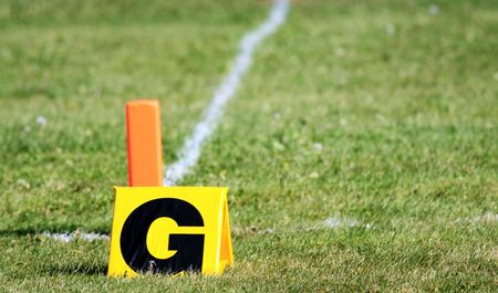 A shot of the endzone showing the goal line and the orange marker.