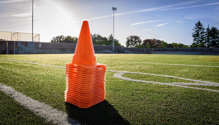 A series of vibrant orange traffic cones neatly arranged on a sports field, creating a clear path for training drills, enhancing focus and agility.