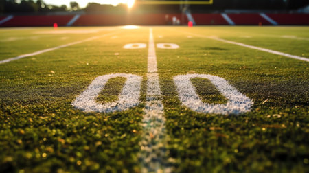 An American football field is showcased during a sunset. The image features vibrant green grass with white markings. The composition utilizes a low-angle perspective, emphasizing the lines and texture. The overall style suggests an outdoor setting, potentially offering possibilities for sports, background, or conceptual use.
