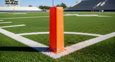A close-up shot of a bright orange pylon marking the corner of the end zone on a pristine American football field. The vibrant green artificial turf and crisp white boundary lines are in sharp focus under the bright sun. This image is an iconic symbol of the goal line and scoring a touchdown.