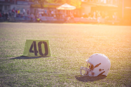 Close up of a white American football helmet on playing field