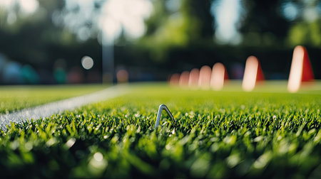 This image captures a close-up view of a metal stake nestled in a lush green sports field, with vibrant cones in the background, all under natural lighting.
