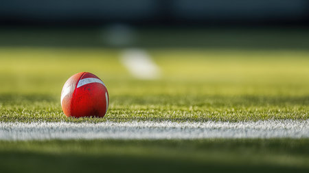 A vibrant red football sits on the green grass beside white field markings, capturing the essence of sport and competition in a serene outdoor setting.