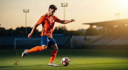 Soccer player kicking the ball on the football field at sunset.