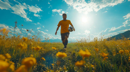 A soccer player enjoys the game in a scenic field with wildflowers under a clear blue sky and radiant sunlight, embodying joy and athleticism.