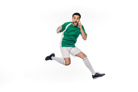 amazed football player in uniform jumping while talking on smartphone on white