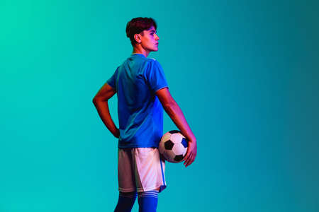 Leader. Football or soccer player on gradient blue studio background in neon light - posing confident with ball. Concept of sport, competition, winning, action, motion, overcoming. Copyspace.