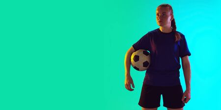 Young female soccer or football player with long hair in sportwear holding ball, posing confident on gradient background, neon. Concept of healthy lifestyle, professional sport, motion, movement.