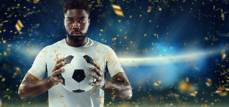 Professional male soccer football player standing on stadium background with festive confetti fireworks.