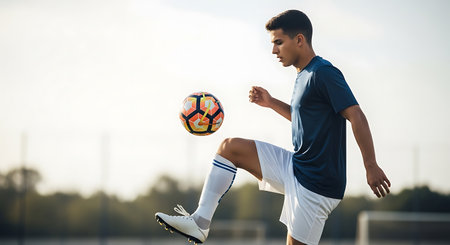 Soccer player performing freestyle tricks with a soccer ball at sunset on a grass field