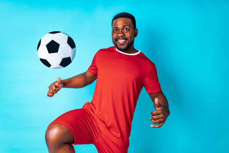 The football championship. A black man in a red T-shirt smiles while kicking a soccer ball. The idea of joy and excitement when a man is fully involved in the game and enjoys himself