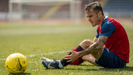 Resilient Players Struggle: A Tattooed Male Soccer Player Grimacing in Pain While Holding His Injured Ankle on the Field Demonstrating Athletic Resilience and the Toughness of Recovery.
