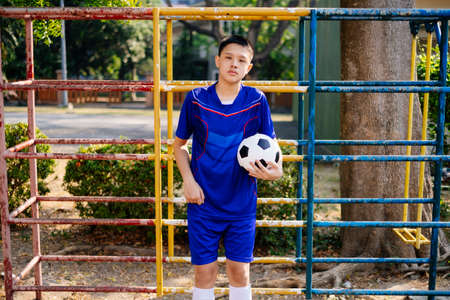 Young boy leaning against climb frame in the playground with football in his hand.