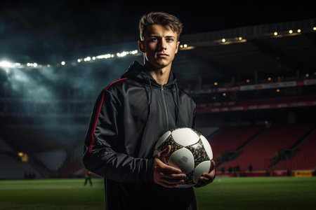 AI Generated. Young athlete poses confidently on the field during twilight with stadium lights illuminating the background