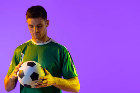 Portrait of young man, professional football player in uniform posing with ball, looking at camera isolated over blue background in neon light. Concept of sport, team game, action, motion.