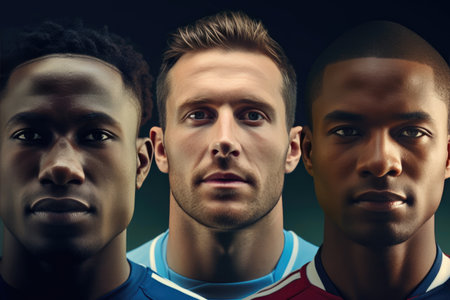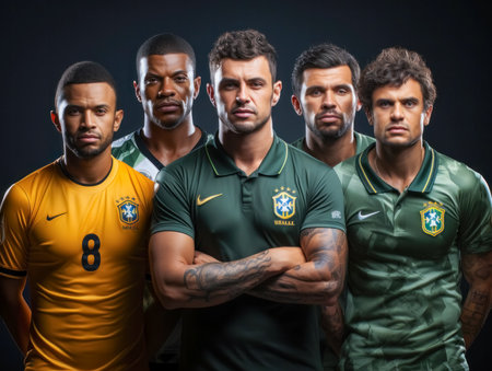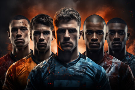 Five male soccer players stand tall on a vibrant green field, silhouetted against a stunning sunset. Their strong stances and numbered jerseys convey teamwork and determination, embodying the spirit of competition and camaraderie.