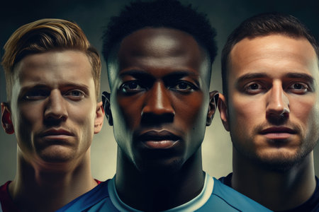 Front view of three Caucasian male soccer players wearing a team strip, standing on a pitch with arms around each other and their right hands over their hearts listening to their national anthem before playing a match, with blue sky in the background