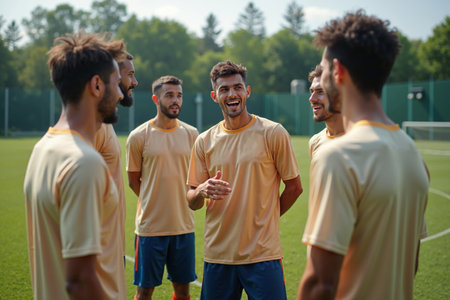 photo of teenage youth soccer player discussing to group at soccer field, generative AI