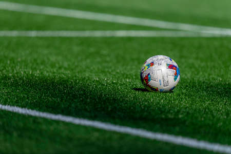 Kyiv, Ukraine - August 17, 2019 soccer ball with his feet on the football field