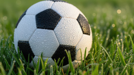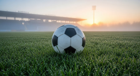 A soccer ball sport field grass morning dew sunrise outdoor competition recreation activity nature landscape focus