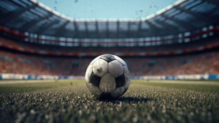 An AI generated illustration of a soccer ball in the field illuminated by stadium lights