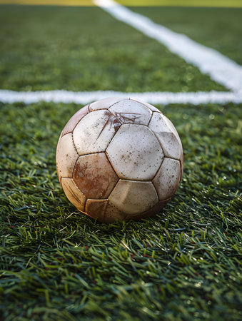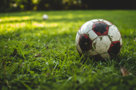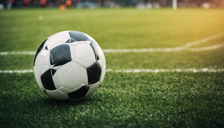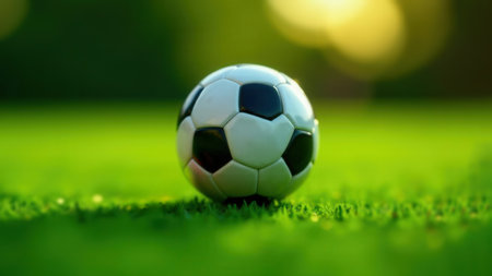 A soccer ball sitting on green grass with soft bokeh lighting in the background, perfect for capturing the spirit of football.