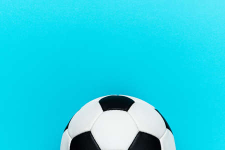 Top view photo of white and black soccer ball as football concept . Minimalist flat lay image of leather football ball over blue turquoise background with copy space.