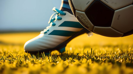 Powerful kick moment captured close-up, showing football boot connecting with ball on turf, emphasizing strength, precision, and energy