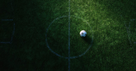 A soccer ball rests on a well-maintained green field, viewed from above. The image showcases the ball within the marked circle of the field, with a rich green hue and textures. The lighting appears natural, suggesting an outdoor setting. This image is suitable for use in sports-related articles or advertising.
