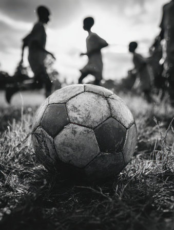 An aged leather ball lies on lush grass, while lively children dash past in a colorful blur, capturing a joyful outdoor moment illuminated by bright sunlight.