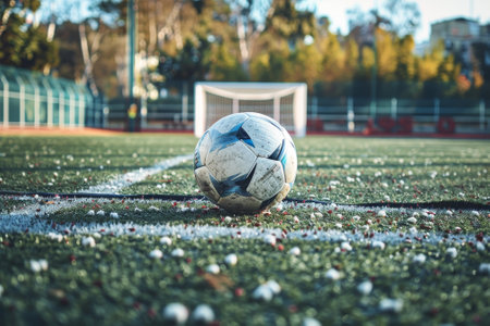 worn soccer ball rests on grass, with a blurred goalpost in the background, surrounded by autumn leaves