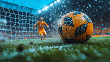 Dynamic close-up of a soccer ball mid-air with water droplets illuminated by sunlight AI